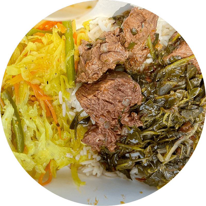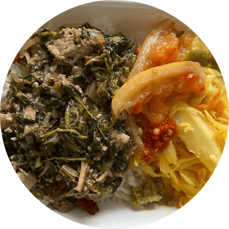 Feuilles de manioc hachées avec du lait de coco et viande de bœuf très tendre. À découvrir.