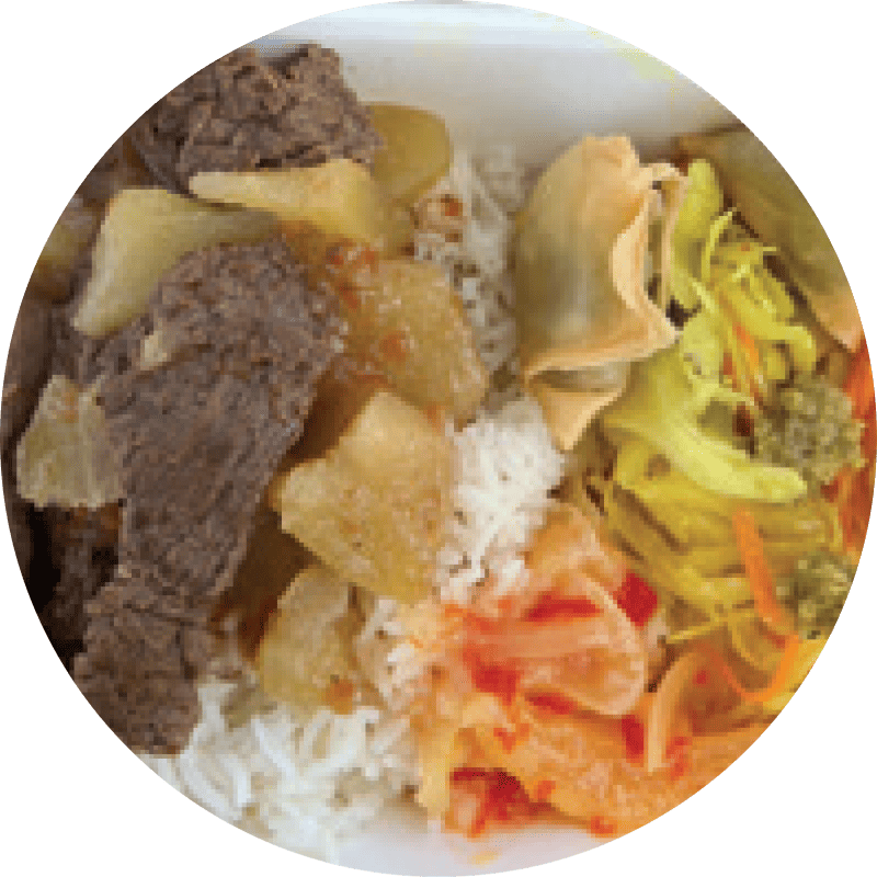 Poitrine de porc cuit tendrement avec du cresson. Accompagné de riz et achards de légumes.