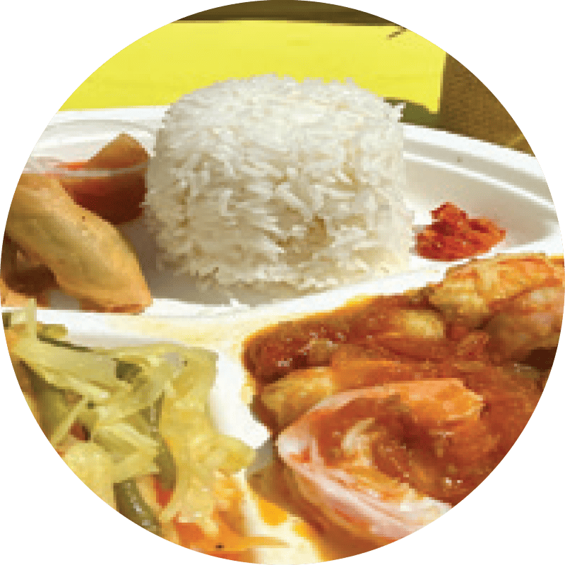 Plat à base de crevettes fraiches décortiquées et son délicieux lait de coco… Servit avec du riz et achards de légumes
