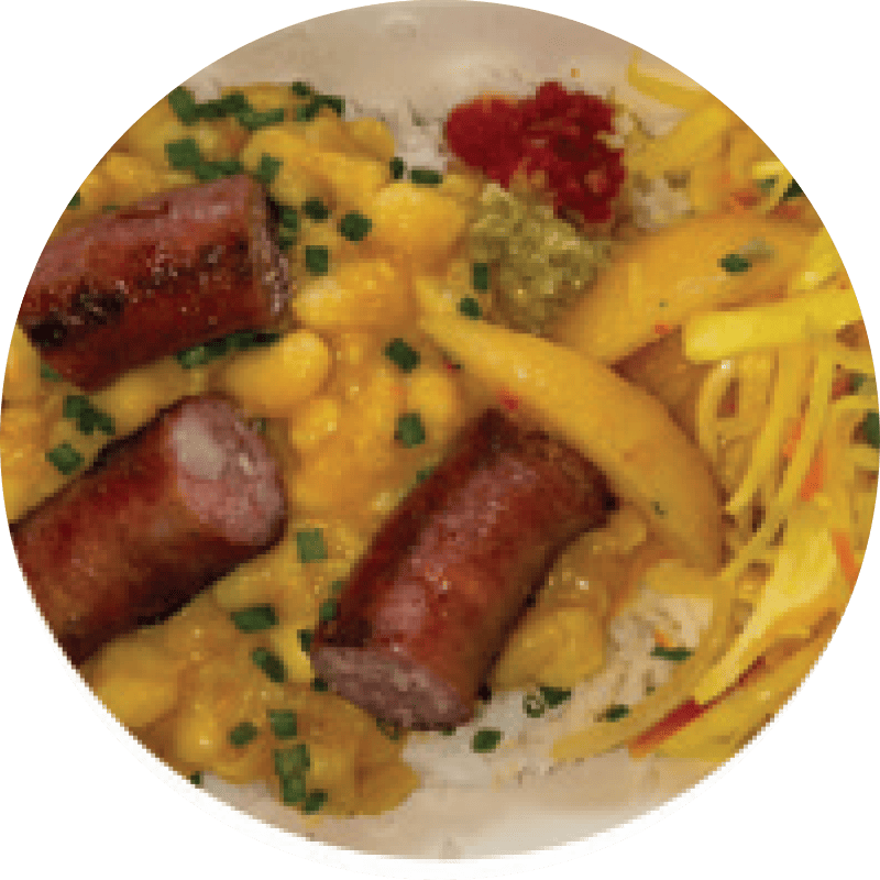 Saucisses aux haricots blancs parfumés au gingembre, au curcuma et au curry de Madagascar. Accompagné de riz et achards de légumes.